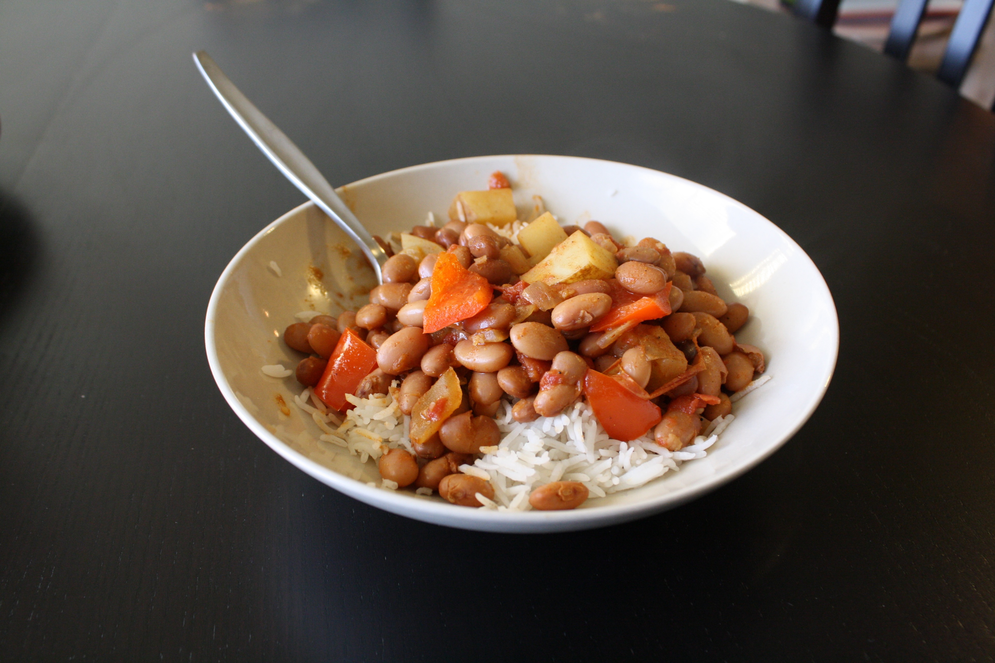 Add your potatoes and cook for another ten minutes. Add the red pepper and the beans and simmer (covered) for 20 minutes or a bit longer, until the potatoes are cooked.